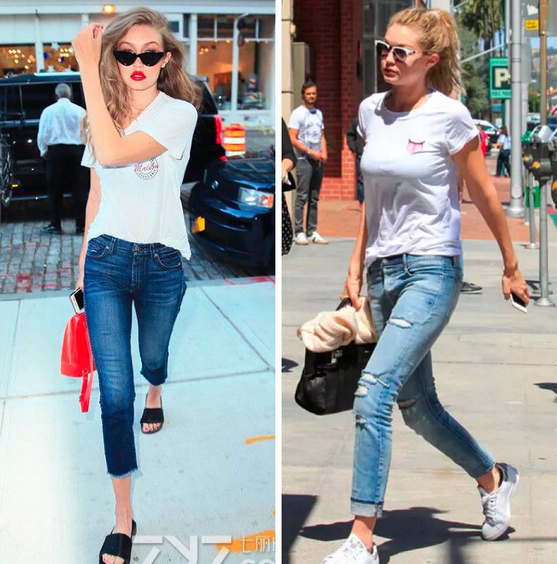 而對于一些寬松的樣式,如果你的腰和腿還算細(xì),那么還可以學(xué)習(xí)Gigi,把T恤扎一點到褲子里,露出腰線: