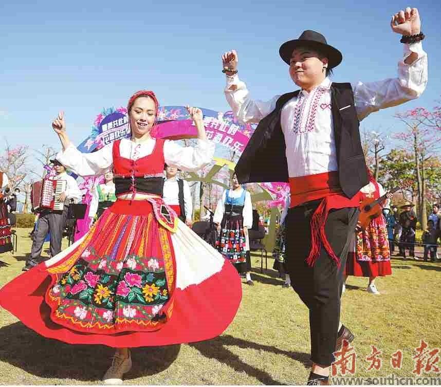 來自澳門的青年在橫琴花海長廊載歌載舞。