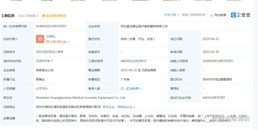 皇佳翼美隸屬于深圳皇佳美業(yè)醫(yī)療美容器械有限公司。企查查APP顯示,深圳皇佳美業(yè)醫(yī)