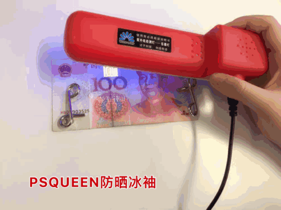 現(xiàn)場(chǎng)情況是這樣的,一號(hào)冰袖在罩住紫外線燈之后,仍然能找出軟妹幣上的防偽標(biāo)識(shí)。紫外光能穿過冰袖,就說明冰袖沒有起到防曬的果。