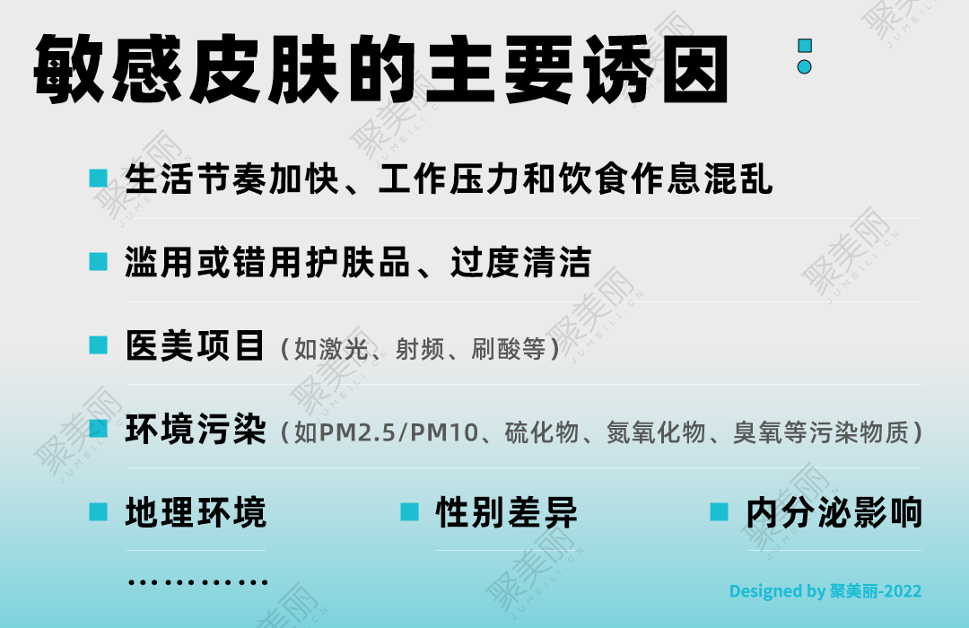 科學研究表明,造成敏感肌的誘因復雜多樣,除了疫情時代長期佩戴口罩之外,生活節(jié)奏加快、工作壓力或醫(yī)美項目等因素,以及環(huán)境污染、換季氣候變化等外部因素都可能導致肌膚屏障受損進而造成肌膚敏感癥狀。