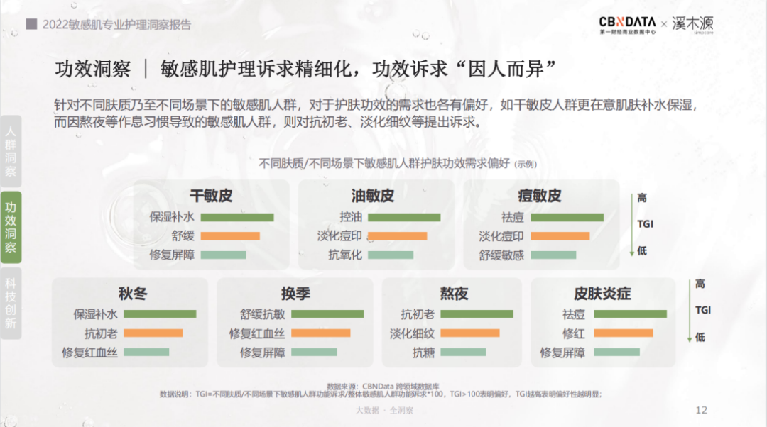 在敏感肌護理訴求精細化的功效洞察下,不同膚質(zhì)、不同場景下敏感肌人群護膚功效需求也各有偏好,如干敏皮人群更在意肌膚補水保濕, 而因熬夜等作息習慣導致的敏感肌人群,則對抗初老、淡化細紋等提出訴求。