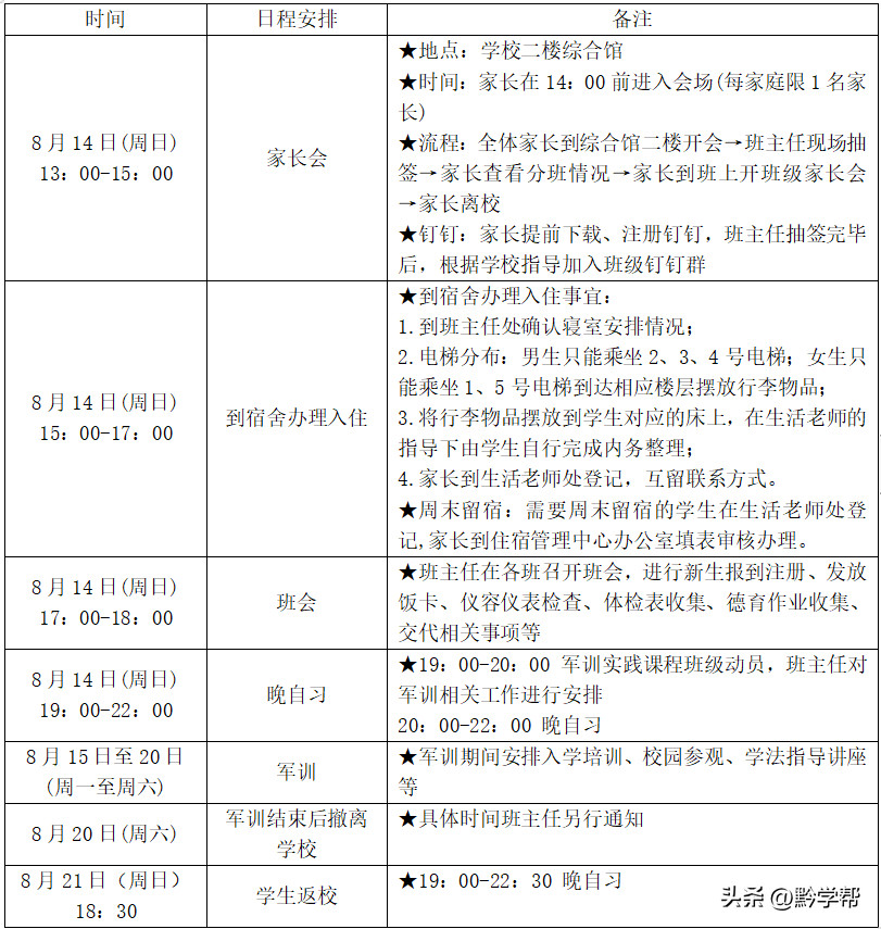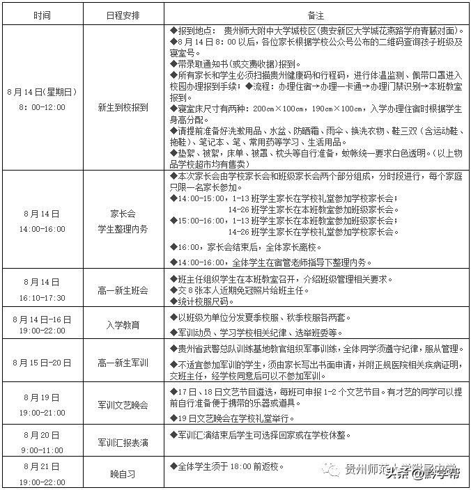 8月14日至20日軍訓(xùn),軍訓(xùn)結(jié)束學(xué)生返家。8月21日下午6點(diǎn)前返校,8月22日正式上課。