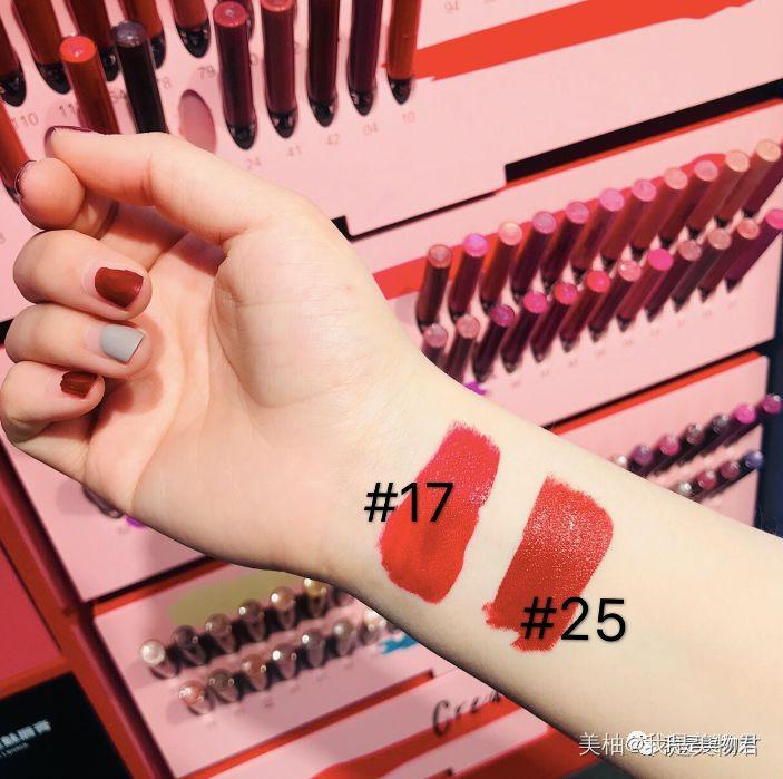 OMG?。?!真的是顏色完全不輸,質(zhì)地絲絨順滑,顏色飽和,而且很滋潤(rùn),涂在嘴上不拔干。熱賣色號(hào)分別是#17和#25,氣場(chǎng)十足!