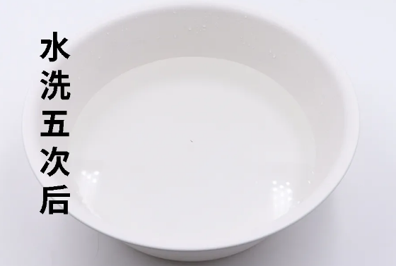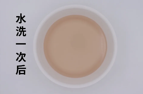 結(jié)論:充分浸泡約15分鐘后,這件防曬衣出現(xiàn)浮色,盆中水呈橙色,屬深色衣物首洗的正?,F(xiàn)象。水洗五次后再次泡盆,它的浮色情況得到改良,盆中余水清澈見(jiàn)底。