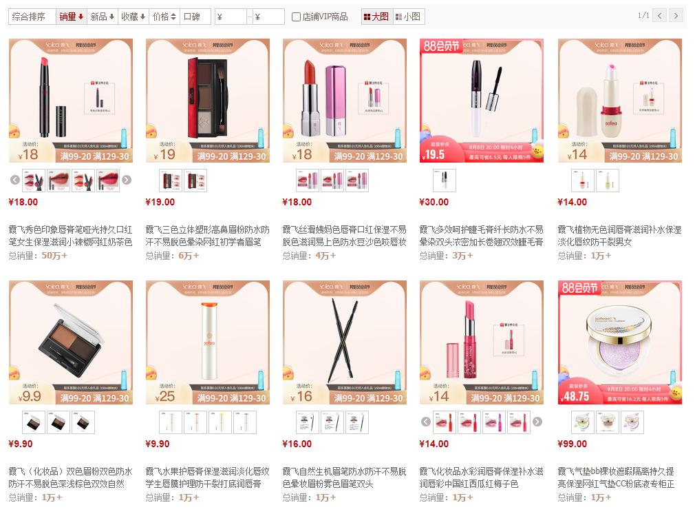 《未來跡Future Beauty》在“霞飛Sofea”天貓旗艦店發(fā)現(xiàn),就產(chǎn)品看,目前店內(nèi)共46個產(chǎn)品鏈接,分為底妝、唇妝、眼妝和卸妝產(chǎn)品四大品類;就定價看,其產(chǎn)品價位從9.9元到99元不等,以20-30元的平價彩妝居多。
