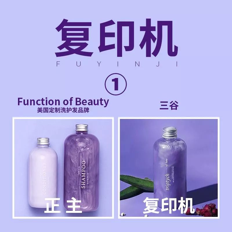 從外觀上看,乍一眼看三谷和Function of Beauty可以說是一毛一樣,再仔細一看,可能會發(fā)現(xiàn)瓶身上的白色英文字體有所不同。而且Function of Beauty是為消費者自身發(fā)質(zhì)和護發(fā)需求定制洗發(fā)水,瓶身可以按消費者需求加上名字,同時有“Made IN USA”字樣。現(xiàn)在,F(xiàn)unction of Beauty的瓶身還可以加上印花等圖案。