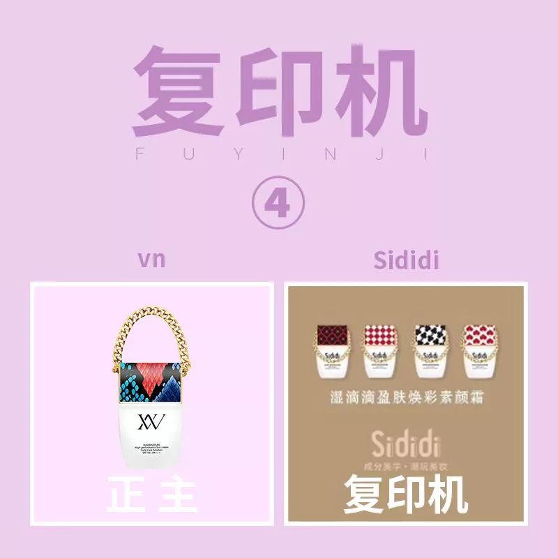 除了上述所說的“全復(fù)印”和“90%復(fù)印”,還有更多的品牌是在出單品的時候“小抄”一下,比如Sididi這個品牌,據(jù)企查查信息是今年6月剛成立的一個品牌,剛成立就開始抄?是把抄襲作為核心能力嗎?被抄襲的韓國VN鉑金包防曬霜今年上半年可火了很久了,蹭熱點也不是這么蹭的吧。