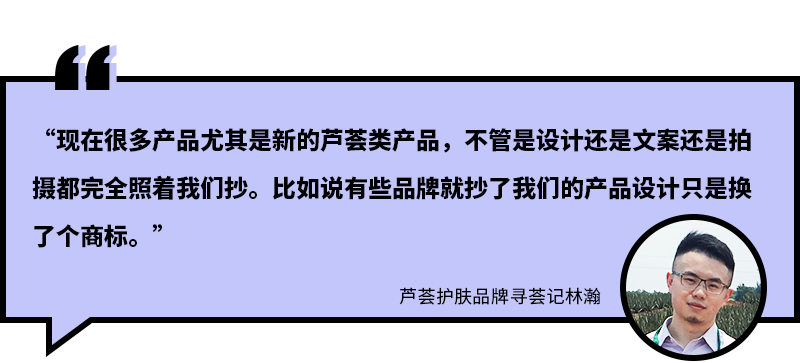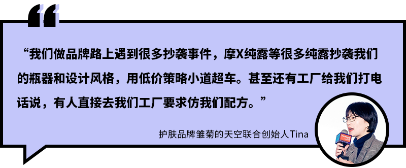 這些坐享其成的抄襲者,輕而易舉地就能摧毀新銳品牌辛苦建起的國貨好形象。而那些花大心血設(shè)計自己的產(chǎn)品的創(chuàng)始人們,遇到被抄襲的情況也是心酸又無奈。