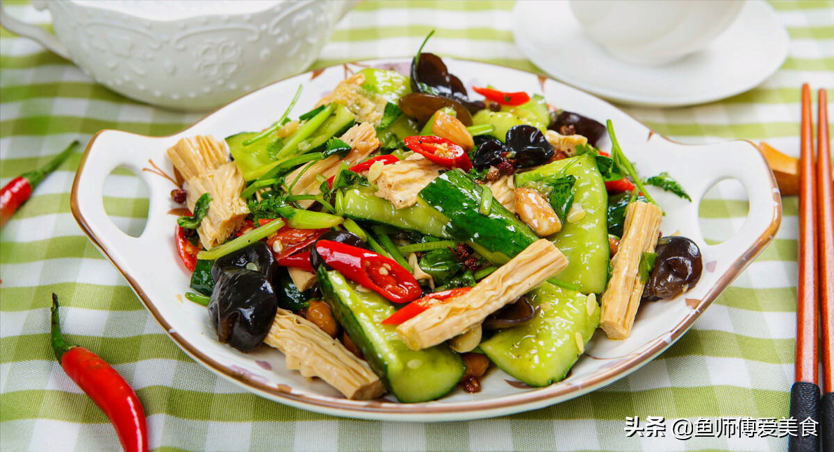 食材:黃瓜3個,腐竹和木耳各適量,干辣椒,蔥,蒜各少許,分別切碎。