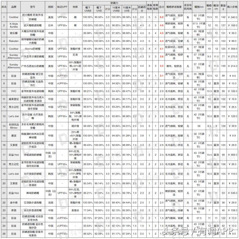 這次我們選取了16個(gè)品牌的26款遮陽(yáng)帽,范冰冰同款后益Hoii遮陽(yáng)帽、網(wǎng)紅品牌VVC和Let's Diet、專業(yè)防曬品牌Coolibar、大眾品牌迪卡儂、以及某寶不知名的銷量爆款都有入選此次評(píng)測(cè),作為本次有調(diào)評(píng)測(cè)的選品。