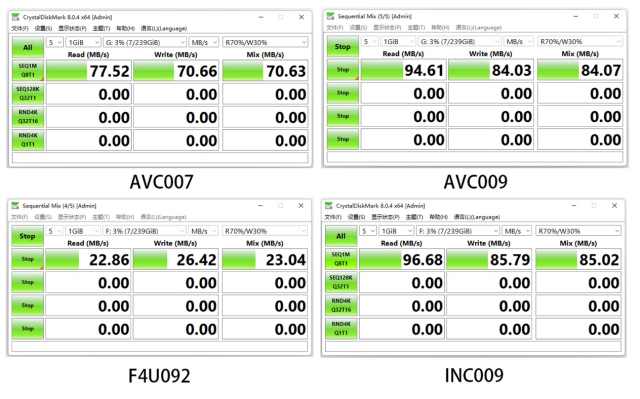 實(shí)測INC009和AVC009兩款擴(kuò)展塢的SD接口能夠達(dá)到94MB/S的讀寫速度,基本上符合SD3.0接口的傳輸速度。AVC007的SD卡接口傳輸速度則為77MB/S,只有單SD卡槽的F4U092傳輸速度則僅有30MB/S。總體來說,這四款擴(kuò)展塢的SD接口都能滿足市面上絕大部分SD存儲(chǔ)卡的讀寫需求,不用太過擔(dān)心跑不滿SD卡。