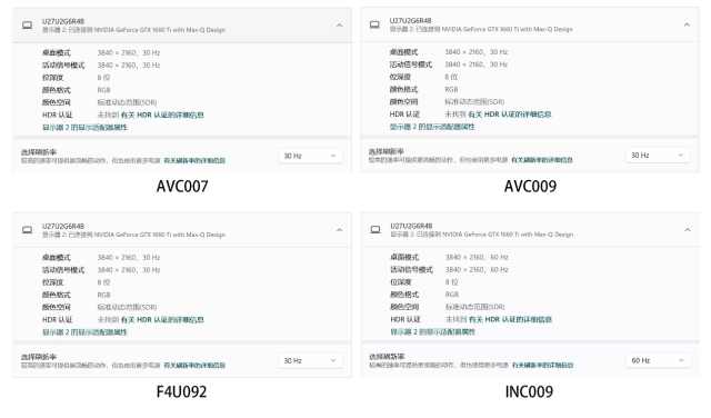 HDMI接口方面,我們直接用筆記本電腦的雷電接口外接一臺(tái)4K144的高刷顯示器,來看看HMDI接口的一個(gè)傳輸帶寬。實(shí)測AVC007,AVC009以及F4U092三款采用HDMI1.4接口的擴(kuò)展塢都能夠傳輸4K30Hz8bit全范圍RGB的一個(gè)視頻信號(hào)。采用HDMI2.0接口的INC009只能夠傳輸4K60Hz8bit全范圍RGB的視頻信號(hào)。