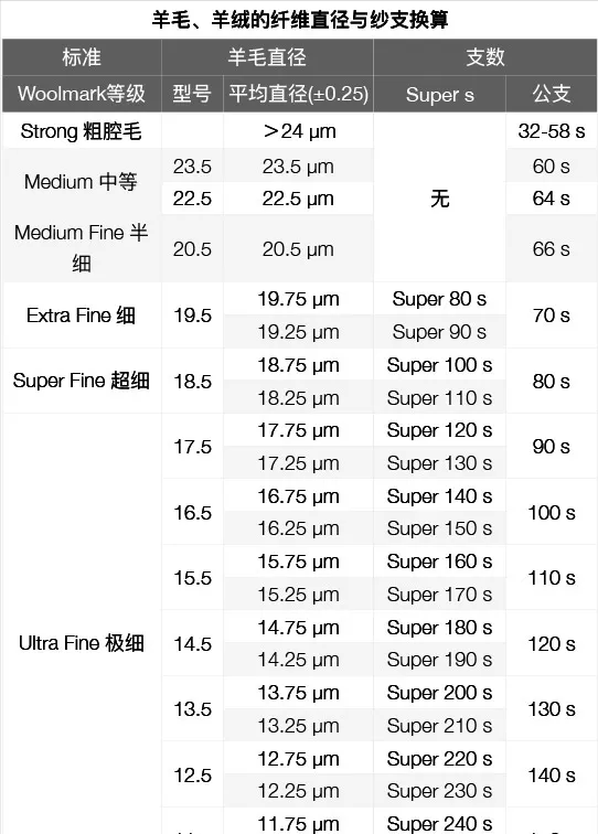 羊毛的支數(shù)和紗線細(xì)度無(wú)關(guān),而是和羊毛直徑對(duì)應(yīng)。公支是傳統(tǒng)羊毛纖維細(xì)度標(biāo)準(zhǔn),但隨著美利奴羊毛的普及,以國(guó)際羊毛紡織組織(IWTO)制定的Super s標(biāo)準(zhǔn)成為主流。
