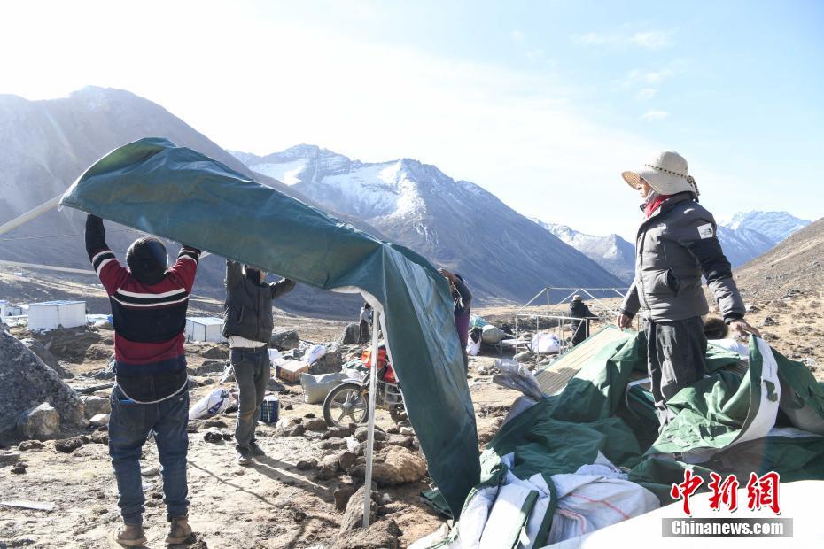 西藏山南市加查縣安繞鎮(zhèn)索囊溝海拔超4500米的草山,盛產(chǎn)加查冬蟲夏草。據(jù)悉,冬蟲夏草是農(nóng)牧民重要收入來源之一。當(dāng)?shù)夭赏谡哌€踐行“生態(tài)采挖”,挖完冬蟲夏草后,覆蓋草皮,盡量減少對(duì)生態(tài)的破壞。圖為4月20日,加查縣安繞鎮(zhèn)的村民在索囊溝冬蟲夏草采挖點(diǎn)搭建帳篷。 中新社記者 貢嘎來松 攝