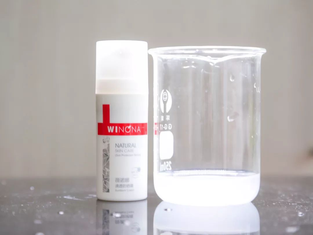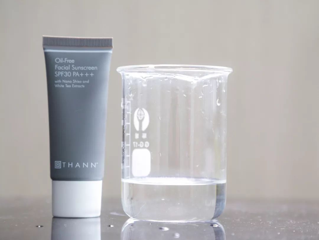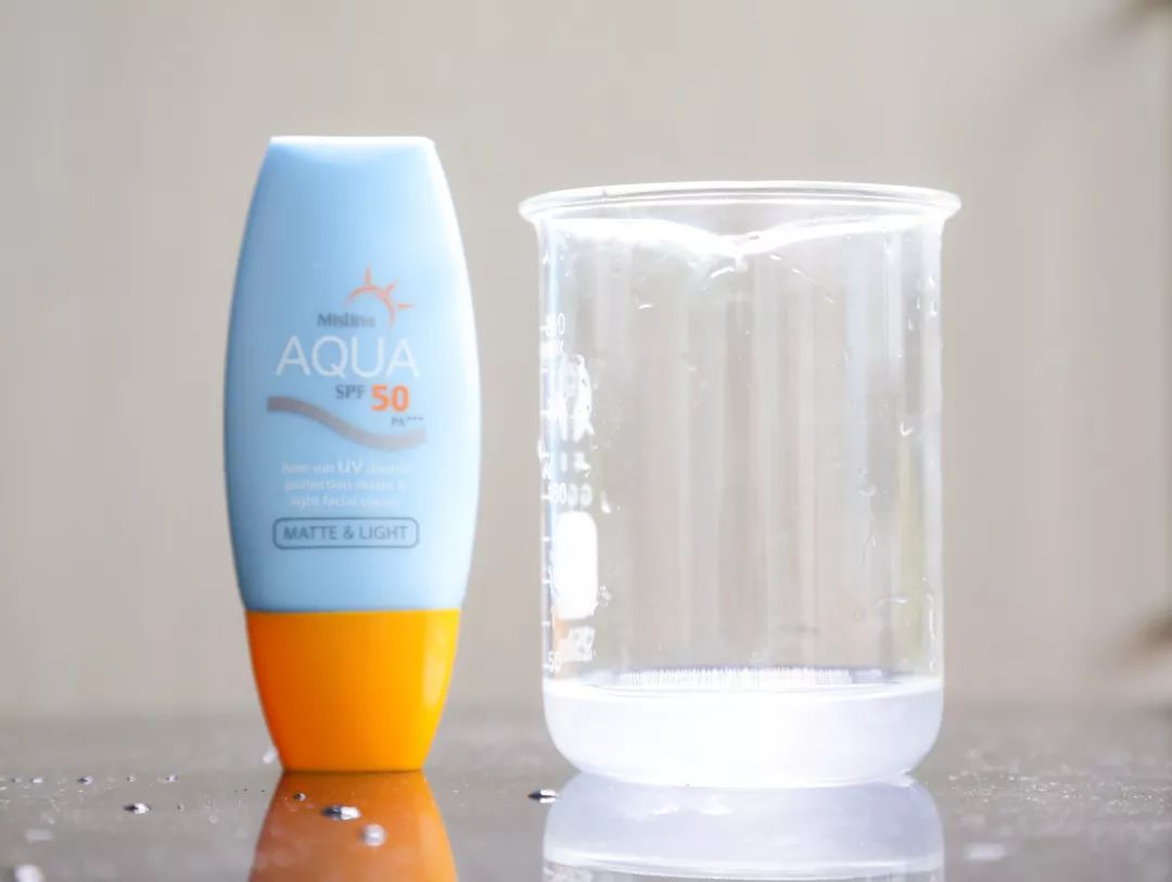 小金瓶的防汗防水能力真的。防曬霜擠入杯中攪拌之后,水依舊清澈見(jiàn)底,完全不溶于水。