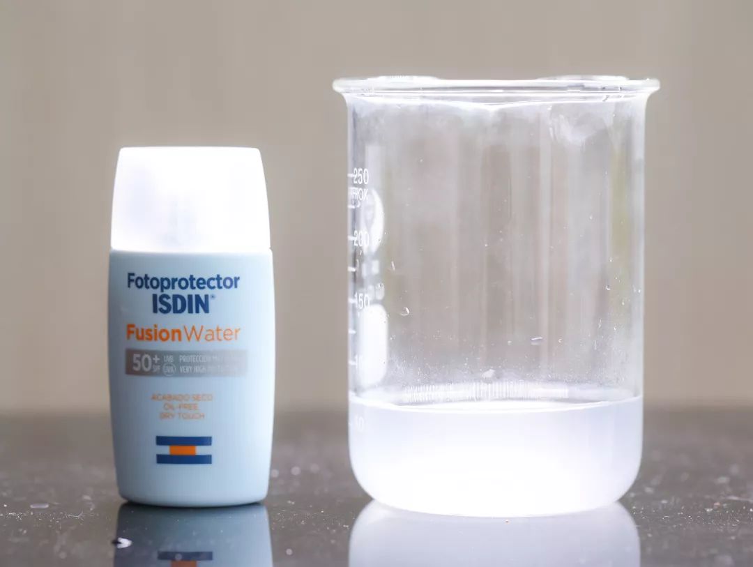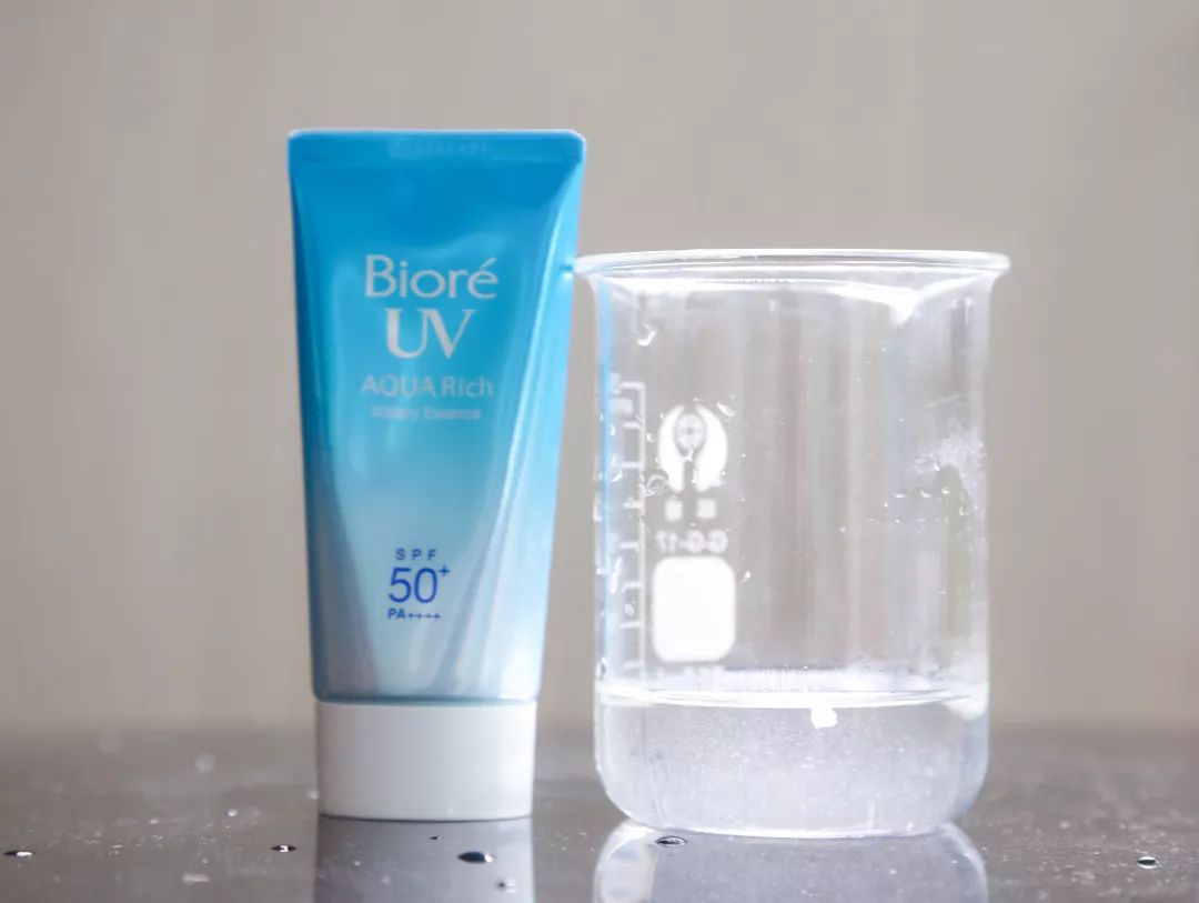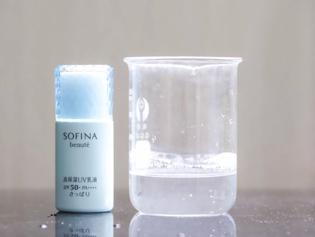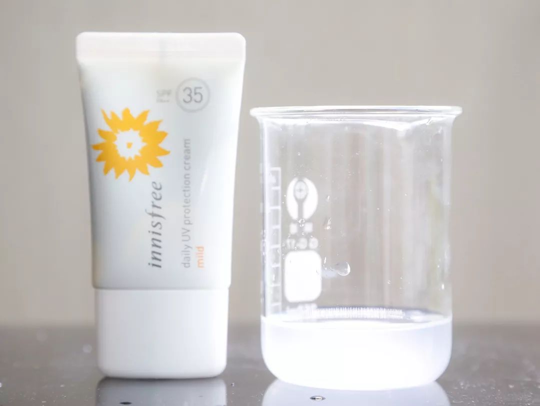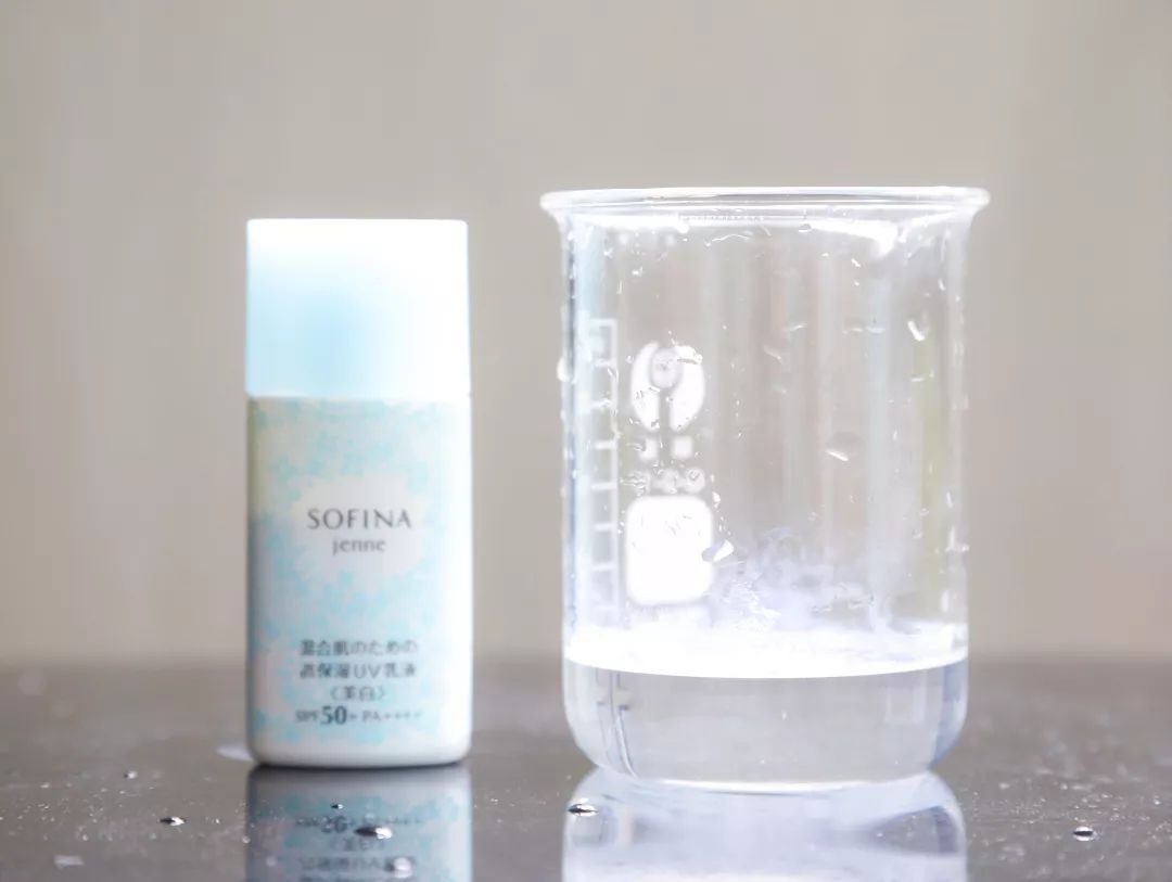 防水能力也不行。防曬霜是完完全全溶于水里了。