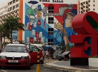 剛好那天是馬來(lái)人的新年街上基本上沒(méi)有什么人,鋪面也關(guān)門了,亞庇這邊的口味很廣東化,三個(gè)人轉(zhuǎn)啊轉(zhuǎn)都沒(méi)有找到吃的,就像霜打了的茄子,后面在一家餐館幾個(gè)人的吃了炒粉,炒面7.5馬幣馬一份(下圖),街上那天格外的安靜,走在路上感覺(jué)時(shí)間都靜止了一般,路上隨處可見(jiàn)的鴿子。晃晃悠悠或許是吃貨本質(zhì)的特性我竟然走去了亞庇市場(chǎng),這里是我愛(ài)的地方了,里面的水果琳瑯滿目的掛滿了重點(diǎn)是很便宜,東南亞的水果真心贊啊,榴蓮,山竹,紅毛丹,鳳梨,木瓜,還有馬來(lái)當(dāng)?shù)氐乃?,我和我的小伙伴吃了一路,亞庇?dāng)?shù)厝苏娴暮芎?,買東西前你可以先試吃,好吃在買,不好吃笑著說(shuō)SORRY就可以,人家依舊熱情,更難得是東西不好吃,也可以換,想想我們?nèi)I榴蓮因?yàn)橛X(jué)得味道不好,店主嘗試后免費(fèi)幫我們換了三個(gè)直到他覺(jué)得好吃。(原諒我只記得吃而忘記拍照,這邊買水果都可以和店主講價(jià))因?yàn)閷?shí)在是沒(méi)有什么人,于是我們決定去逛亞庇商場(chǎng)(這邊商場(chǎng)一般是10點(diǎn)才上班開門)愛(ài)美女士可以去買護(hù)膚品和化妝品,比國(guó)內(nèi)還是優(yōu)惠些,下圖就是商場(chǎng)旁邊的涂鴉很有味,商場(chǎng)對(duì)面有比較有特色的涂鴉感興趣的可以去看下。