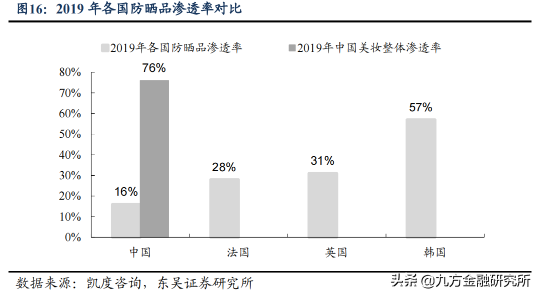 與英美韓相比,我國防曬品仍處于發(fā)展初期,滲透率提升空間較大。由于我國消費(fèi)者一向重視美白和抗老,機(jī)構(gòu)看好未來我國防曬滲透率不斷提升,并帶動(dòng)防曬市場步入下一增長階段。