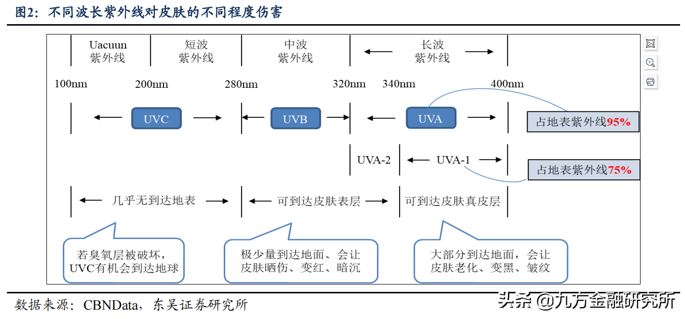 吸收波段來看,主要可分為UVA防曬劑、UVB防曬劑和廣譜防曬劑。長波紫外線UVA可達(dá)到皮膚層造成皮膚曬黑和光老化,中波紫外線UVB可到達(dá)皮膚表層造成皮膚曬傷。UVA由于波長范圍大,通常分為UVA-1 和UVA-2,UVA-1是地表紫外線主要來源,UVA-2在物理和生物學(xué)效應(yīng)上與UVB相近。