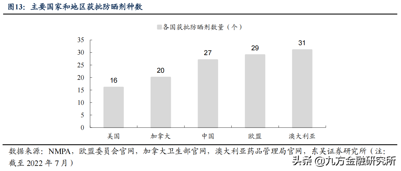 由于防曬劑若添加不規(guī)范可能對皮膚健康造成影響,因此世界各國對于防曬劑添加管理均較為嚴(yán)格,采用白名單管理。中國目前獲批可使用的防曬劑共27種,數(shù)量上處于世界中游水平。