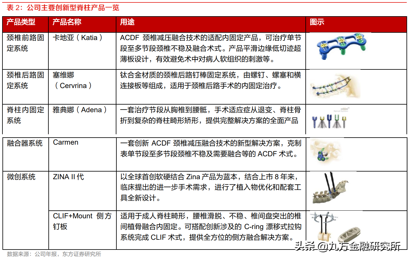 研報(bào)菌簡評:創(chuàng)新產(chǎn)品如Adena脊柱內(nèi)固定系統(tǒng)、Zina脊柱微創(chuàng)內(nèi)固定系統(tǒng)、HailsPEEK椎間融合器系統(tǒng)等等。