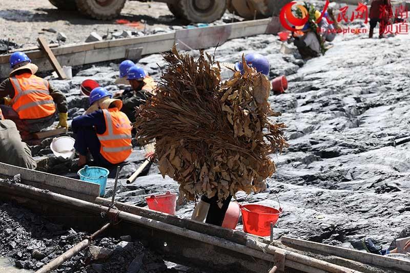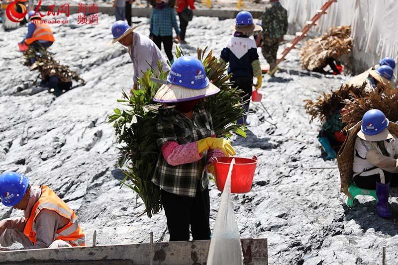 人民網(wǎng)儋州5月27日電 (孟凡盛、李學(xué)山) 近日,海南多地出現(xiàn)高溫天氣,局部地區(qū)高氣溫達(dá)44.2攝氏度,為了應(yīng)對酷暑天氣,人們各出奇招。5月27日,記者在海南省重點(diǎn)工程、位于儋州市境內(nèi)的天角潭水利樞紐工程項(xiàng)目工地采訪時(shí),發(fā)現(xiàn)這里的農(nóng)民工就地取材,用綠植等做成類似一把大蒲扇的形狀,綁在背上,既能減輕陽光的暴曬,又不耽擱手頭的工作,可謂是一舉兩得的降溫神器。