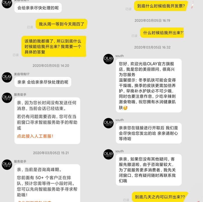 3月3日,小劉找到了淘寶(天貓)客服小蜜介入處理。在小蜜處反饋完后再去找Olay客服,但Olay客服讓她登記了一些信息后,依然沒有承諾什么時(shí)候能開出來(lái)發(fā)票。