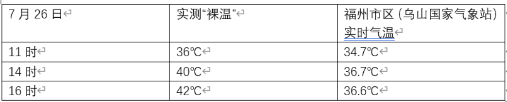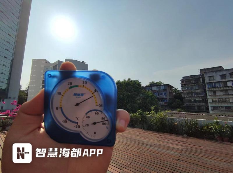記者今天用簡(jiǎn)易測(cè)溫計(jì)在海峽都市報(bào)社天臺(tái)分三次進(jìn)行了測(cè)溫。11時(shí),測(cè)得的氣溫在36℃左右,此時(shí)福州市區(qū)(烏山氣象站)記錄到的氣溫為34.7℃,體感較前一天略微涼爽。但14時(shí),測(cè)溫計(jì)指針已指向40℃附近,此時(shí)福州市區(qū)(烏山氣象站)測(cè)得36.7℃,記者在室外待了段時(shí)間便汗流滿面。到16時(shí),簡(jiǎn)易測(cè)溫計(jì)測(cè)得氣溫在42℃左右,此時(shí)福州市區(qū)(烏山氣象站)測(cè)得36.6℃,體感仍較悶熱。