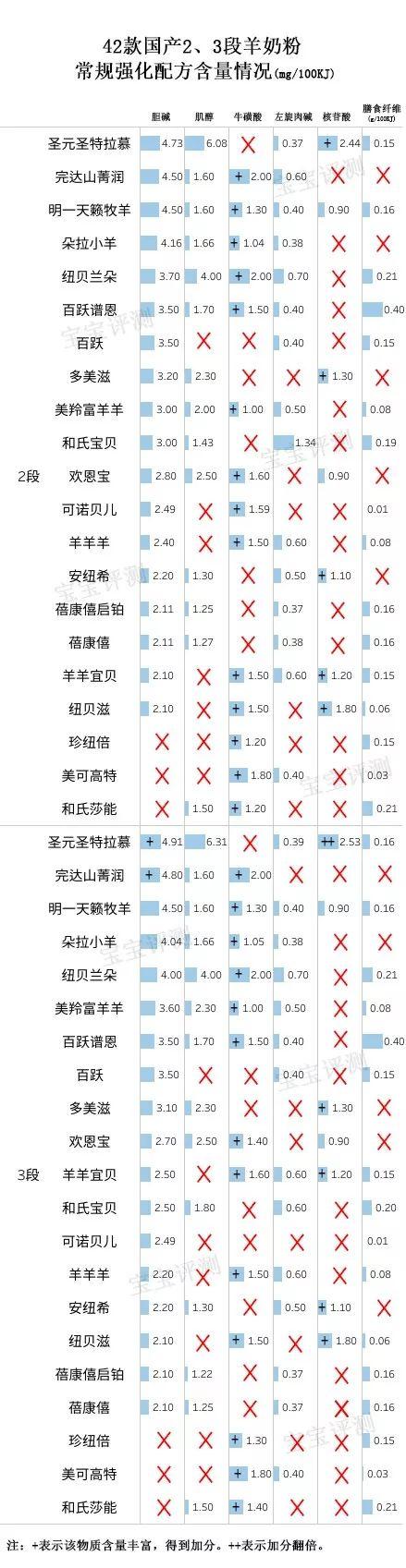 ③2款羊奶粉的膽堿含量較多、27款羊奶粉的?;撬?/strong>含量較多、10款羊奶粉的核苷酸含量較多,得到額外加分(標(biāo)注為+)。