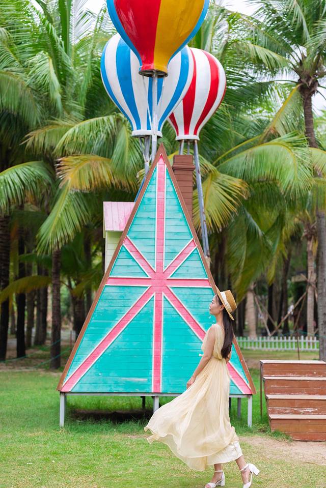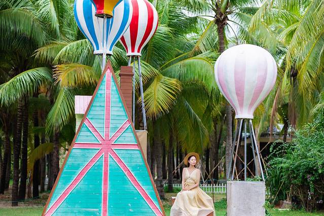 椰夢(mèng)長(zhǎng)廊美的是日落,我們是下午來(lái)的,主要為了找這個(gè)拍攝基地,看到有小車,有熱氣球等道具,找地方停車就好。