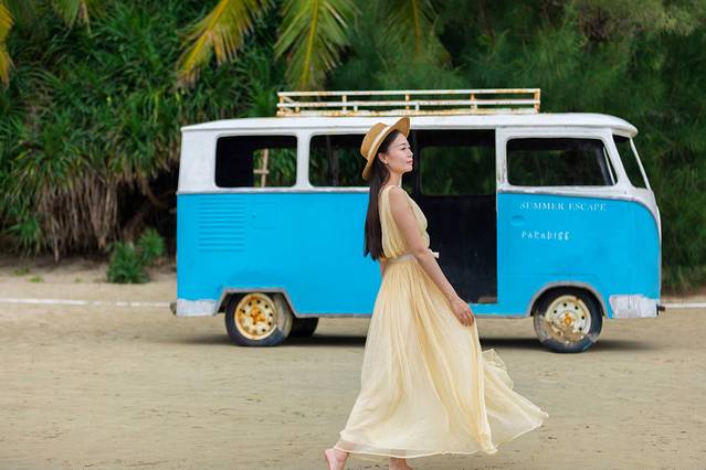 往前走了一小段,幾乎沒(méi)有人了,我們便開(kāi)啟了拍拍拍模式。椰樹(shù),小船還有復(fù)古的小車,這里和 三亞灣相比,海更藍(lán),人更少,也很安靜。