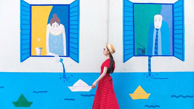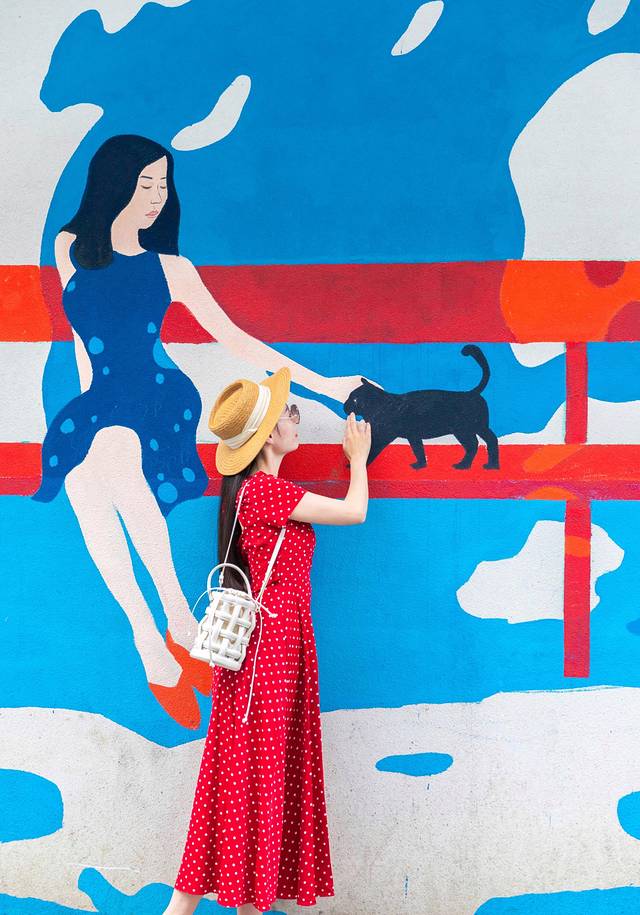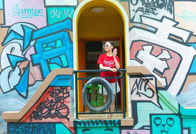 這個(gè)街巷里兩旁都是酒店,酒店外墻都被涂上了五顏六色的墻繪,巷子不長(zhǎng),逛逛很快就結(jié)束了。
