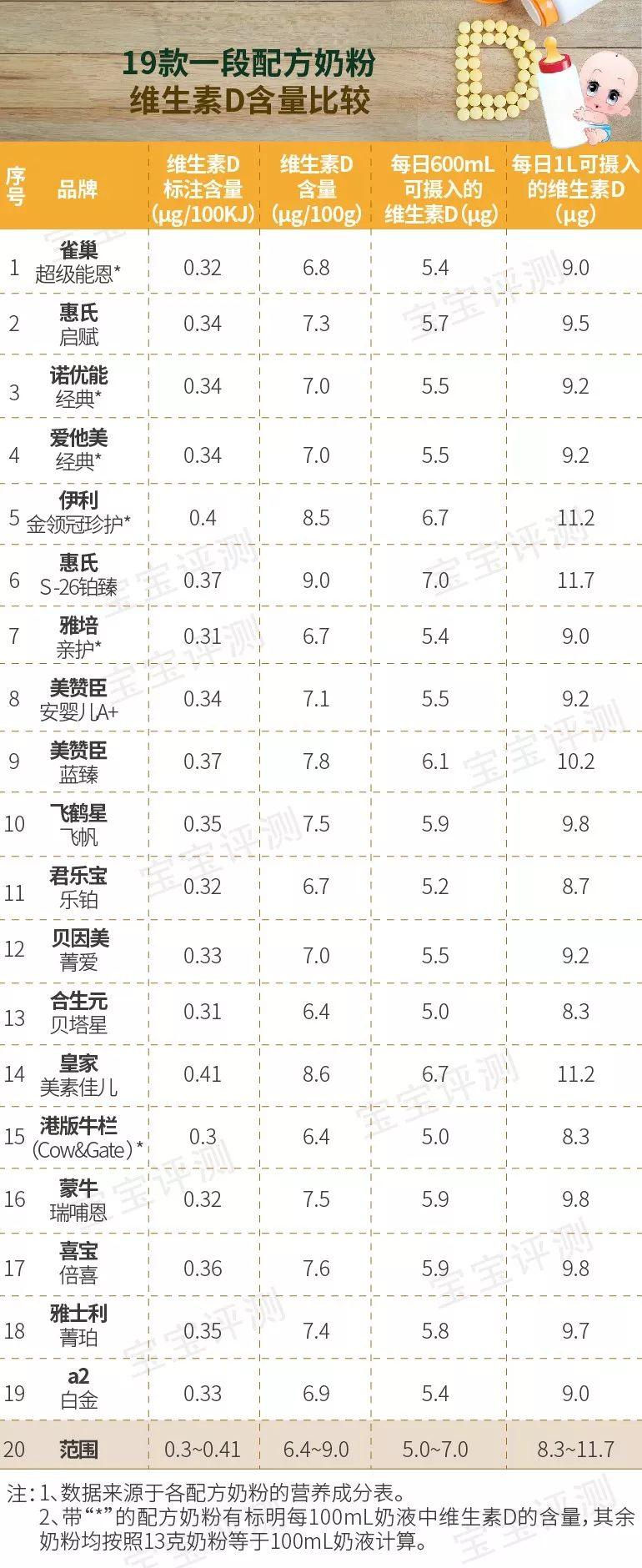 在笨爸爸隨機(jī)抽取的19款一段奶粉中,維生素D含量范圍是6.4~9.0微克/100g.