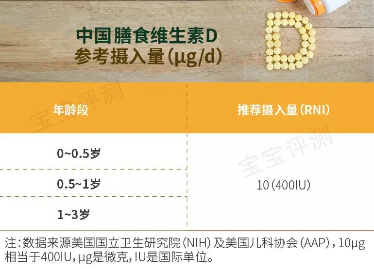 根據(jù)《中國(guó)居民膳食營(yíng)養(yǎng)素參考攝入量(2013年版)》的數(shù)據(jù),0~0.5歲、0.5~1歲、1~3歲這3個(gè)年齡段的寶寶每日都應(yīng)該攝入10微克,也就是400IU的維生素D。