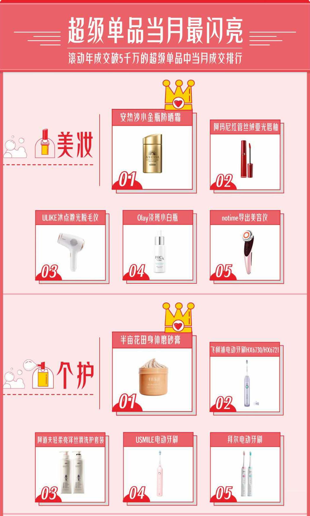 榜單還公布了美妝、個(gè)護(hù)和家清三大品類中年成交破5千萬的“單品”。在這份當(dāng)月成交排行榜單中,美妝部分TOP排行榜除了防曬霜、口紅等護(hù)膚品,ULIKE冰點(diǎn)激光脫毛儀和notime美容儀器也成功超越其他若干美妝產(chǎn)品,排名第3和第5。