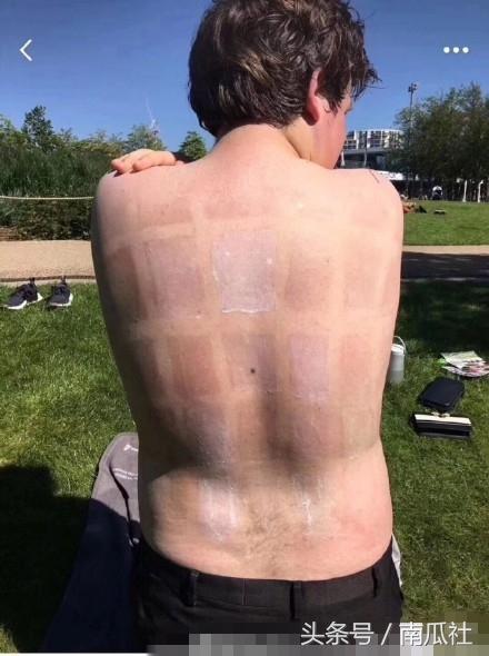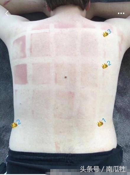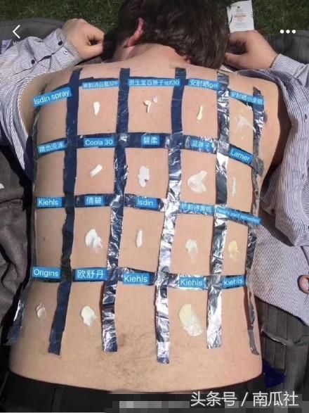 該男子將15種防曬霜分成20格涂在后背,用膠帶隔開(kāi),然后在太陽(yáng)下暴曬,有部位曬紅曬黑后,將膠帶取下驗(yàn)證15種防曬霜的防曬效果。