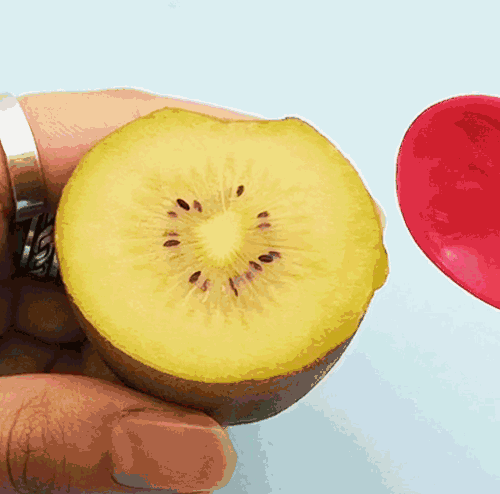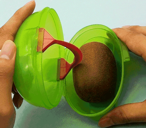 它的形狀有點像獼猴桃,但底部是方形的,可以平放在桌子上。盒子里配備了額外的工具:帶鋸齒的拱形圈+勺子,可以將獼猴桃切成兩半,用小勺子挖著吃,簡直是懶癌患者的福音!