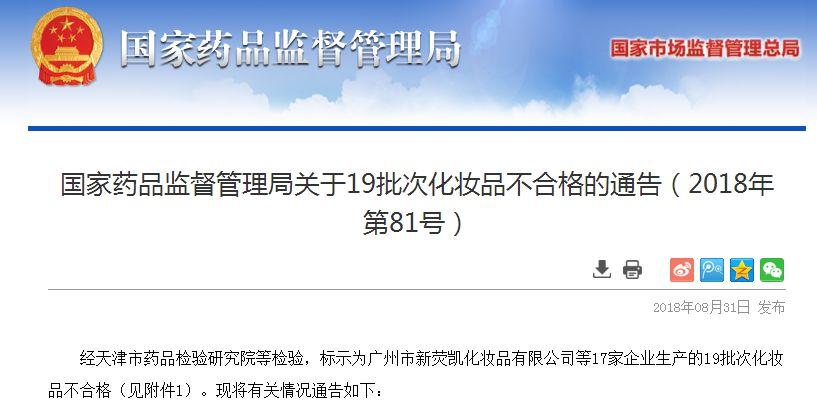 8月31日,藥品監(jiān)督管理局官網發(fā)布關于19批次化妝品不合格的通告。通告稱,經天津市藥品檢驗研究院等檢驗,標示為廣州市新熒凱化妝品有限公司等17家企業(yè)生產的19批次化妝品不合格?,F(xiàn)將有關情況通告如下: