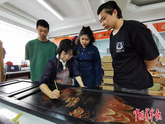 胡昕(左二)教授學(xué)生金漆鑲嵌技藝。陳鼎/攝