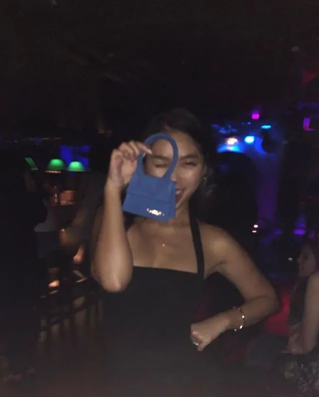 Jacquemus的mini小包她也擁有好幾個(gè),選了藍(lán)色搭配黑色one piece禮服。