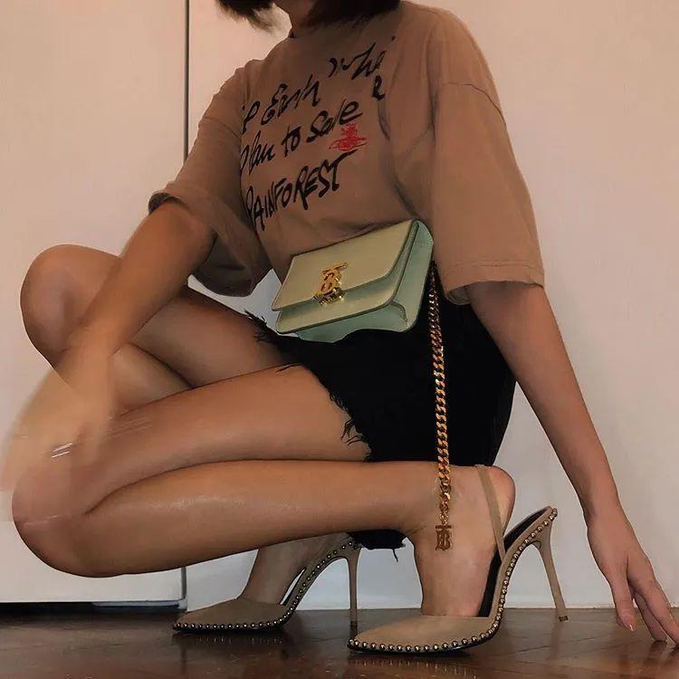當(dāng)身上是比較中性的穿搭時(shí),在包款上她會(huì)選擇偏少女風(fēng)格作為中和,特別的薄荷綠Burberry小腰包就合適。
