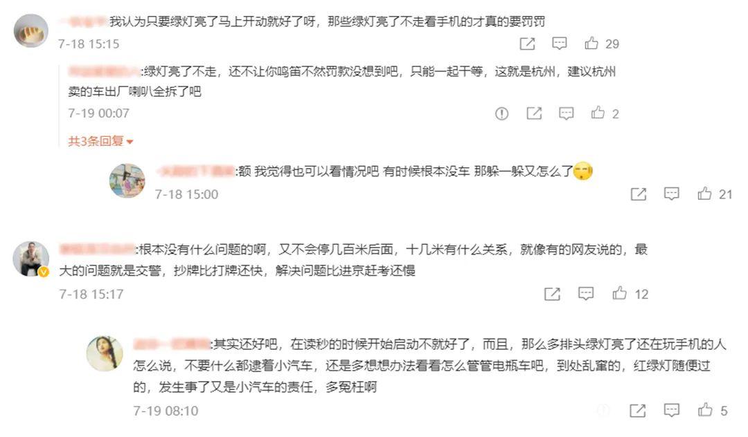對(duì)此,不少網(wǎng)友都各抒己見給出了自己的看法,有部分網(wǎng)友表示深有體會(huì),認(rèn)為前面是紅燈,停這后面與停前面區(qū)別不大。并且認(rèn)為前面留空的話也不會(huì)影響起步,反而能讓頭車有足夠加速距離,更快速地通過綠燈。