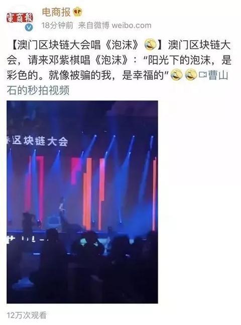 傳言歸傳言,呼聲歸呼聲,好事的我們真的找到一名在世界區(qū)塊鏈大會(huì)現(xiàn)場的觀眾,并詢問鄧紫棋是否演唱了這首歌。答案是:她沒唱《泡沫》,而是唱了《喜歡你》。不知道是不是可以這樣理解:《泡沫》代表了韭菜們的心聲,《喜歡你》代表了割韭菜者的心聲。