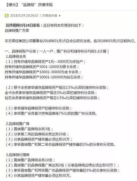他們并不是來看熱鬧的,因?yàn)樗麄兪稚线€舉著一條打著“品牌鏈必火”的條幅。尋找中國創(chuàng)客(ID:xjbmaker)記者查詢發(fā)現(xiàn),品牌鏈為深圳微信食品股份有限公司推出,將區(qū)塊鏈與品牌的結(jié)合。不過根據(jù)搜索,有反傳銷網(wǎng)站稱該鏈的等級制獎(jiǎng)勵(lì)的推廣模式與《禁止傳銷條例》有沖突,涉嫌傳銷。