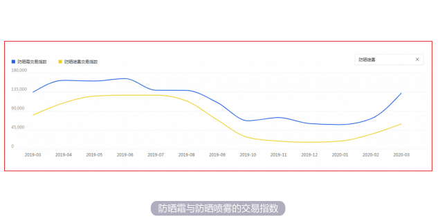 防曬產(chǎn)品的銷售也與季節(jié)聯(lián)系緊密,進(jìn)口防曬和國產(chǎn)防曬在不同渠道占據(jù)各自優(yōu)勢(shì)。生意參謀數(shù)據(jù)顯示,過去一年中(2019.3-2020.3),3至8月期間防曬產(chǎn)品交易指數(shù)高,同時(shí)在搜索人氣、搜索熱度、交易指數(shù)等指標(biāo)上,防曬霜要高于防曬噴霧。