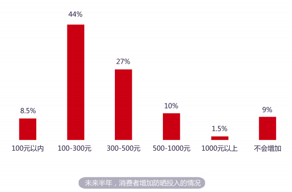 不過,《防曬產(chǎn)品市場(chǎng)調(diào)研報(bào)告》顯示,9成消費(fèi)者表示未來半年會(huì)增加在防曬產(chǎn)品上的投入,44%的表示會(huì)增加100-300元。