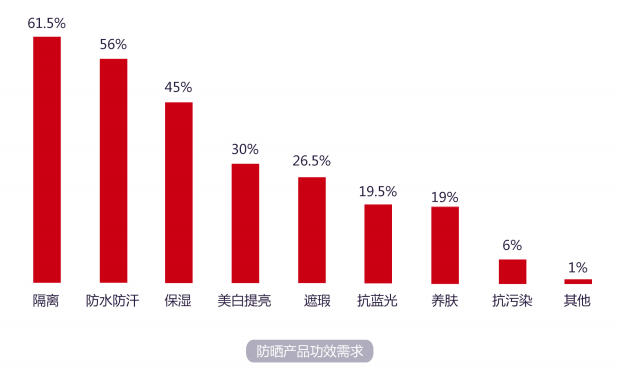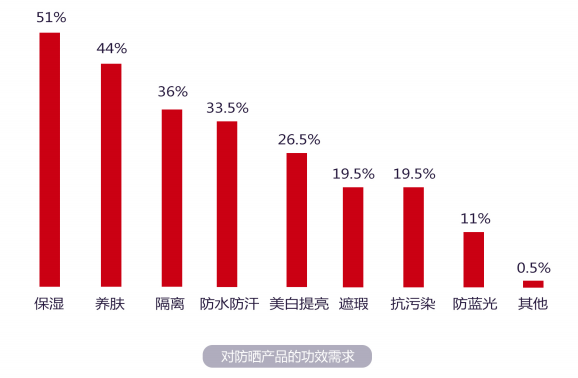 而除了防曬這一基礎(chǔ)功能外,51%的消費(fèi)者還很注重防曬產(chǎn)品的保濕功,44%的消費(fèi)者則看中養(yǎng)膚功。也就是說,單一功的防曬產(chǎn)品已無法滿足更多消費(fèi)者的需求。
