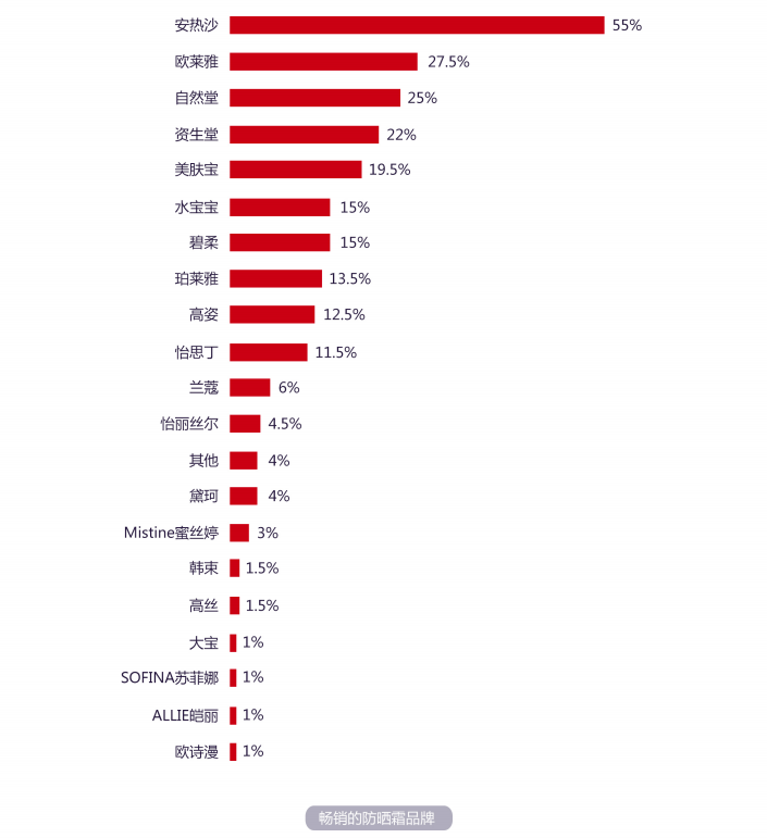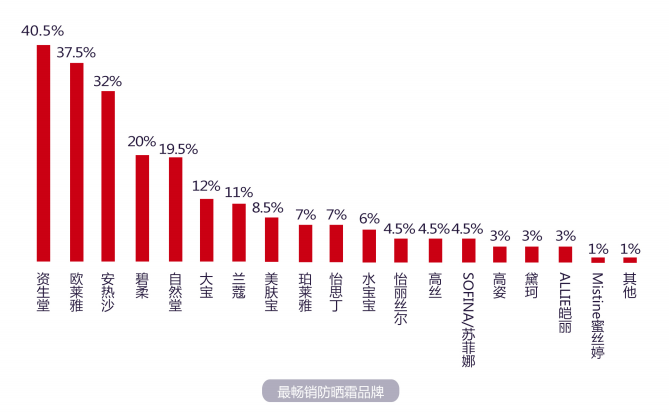分品牌來看,報(bào)告顯示,有40.5%的消費(fèi)者購買了資生堂的防曬霜,緊隨其后的是歐萊雅和安熱沙。進(jìn)口品牌防曬霜占據(jù)了前三席。