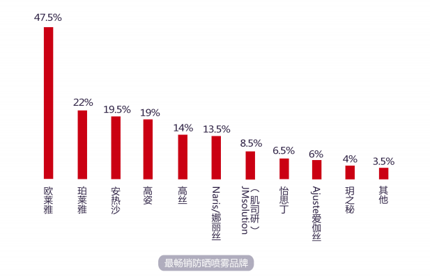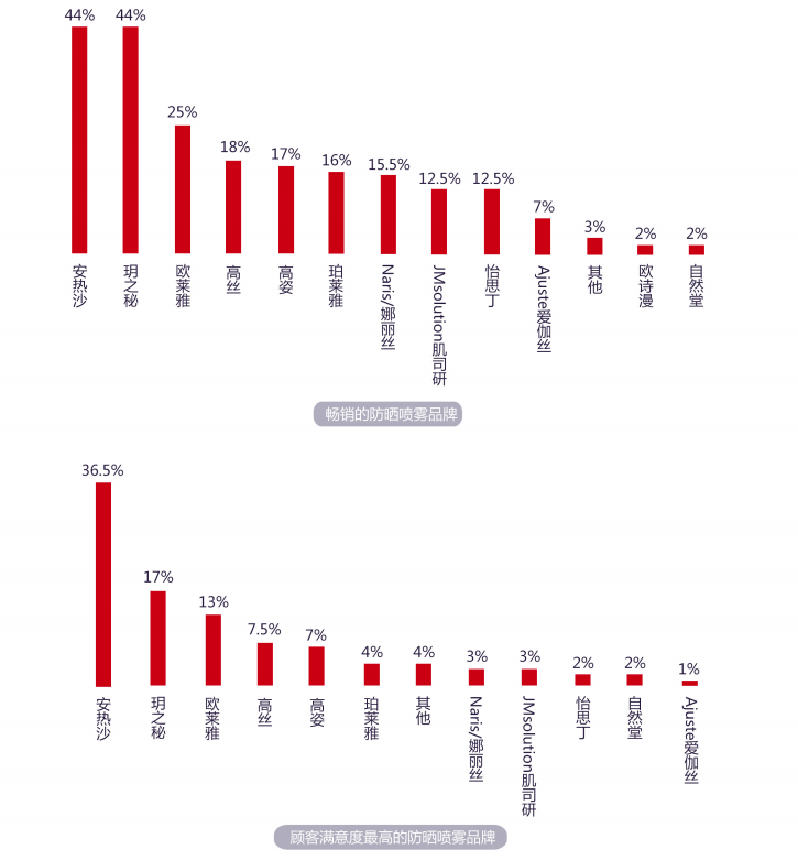 就防曬噴霧而言,有44%的BA表示銷售多的是安熱沙和玥之秘的防曬噴霧,活躍的品牌還包括歐萊雅、高絲、高姿、珀萊雅等。不過,門店顧客仍對(duì)安熱沙防曬噴霧滿意。